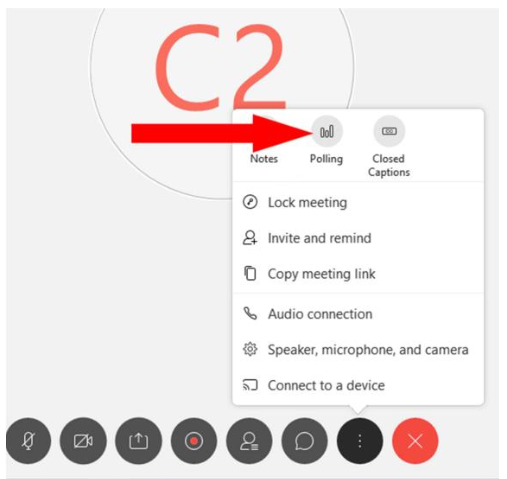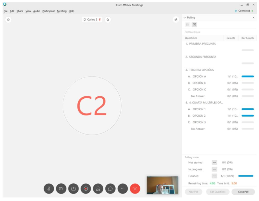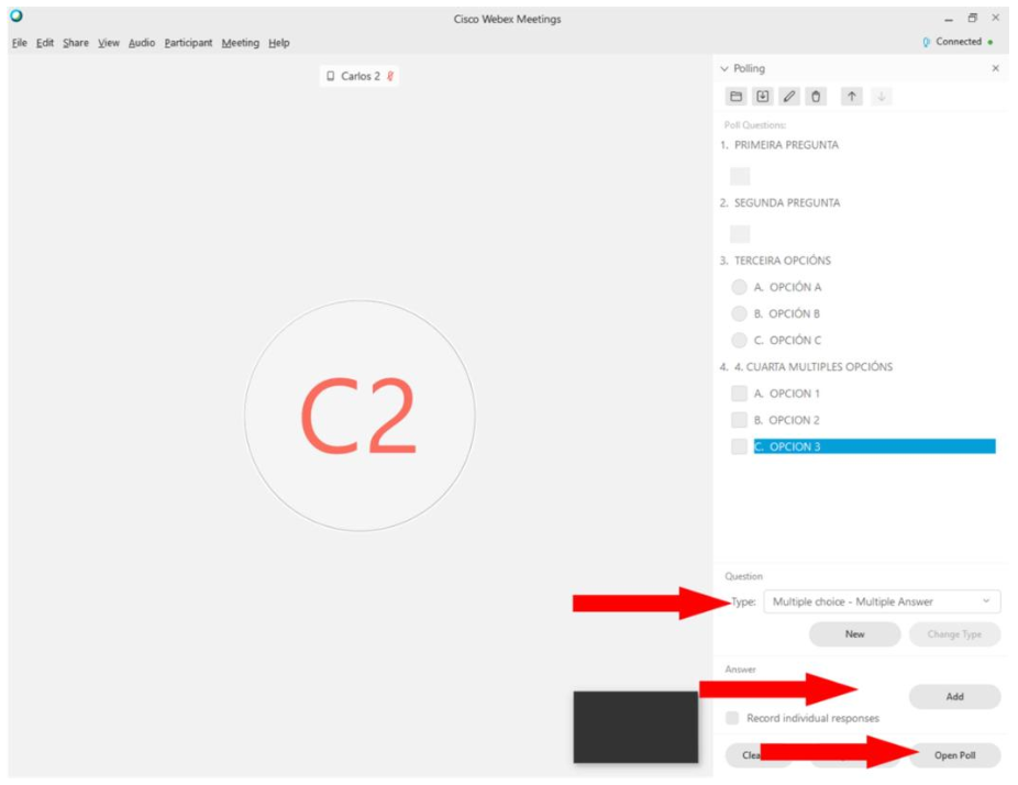 Premendo sobre o botón, e posteriormente sobre a opción de Enquisas (Poll), actívase o panel que permite facer enquisas ou exercicios en liña: