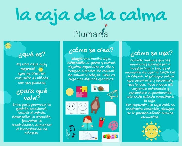 Será algo que nos axude a relaxarnos cando estamos enfadados ou nerviosos. Só tedes que buscar unha caixa que teñades pola casa e decorala como máis vos guste. Despois metedes dentro cousiñas que vos axuden a estar calmados, concentrados ou contentos. Poden ser obxectos, debuxos, mensaxes... Por exemplo: unha pelota antiestrés, mandalas para colorear, mensaxes de persoas que queremos, un xoguete que vos guste moito, algún obxecto cun olor relaxante ... e moitas outras cousas. Tamén podemos poñer esa caixa nun rincón da casa no que nos sintamos ben.