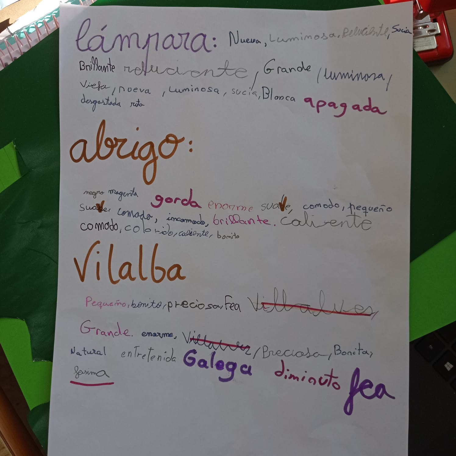 Estes son algúns dos moitísimos adxectivos que se nos ocorreron en clase para estas palabras. Vós tiñades algo distinto?