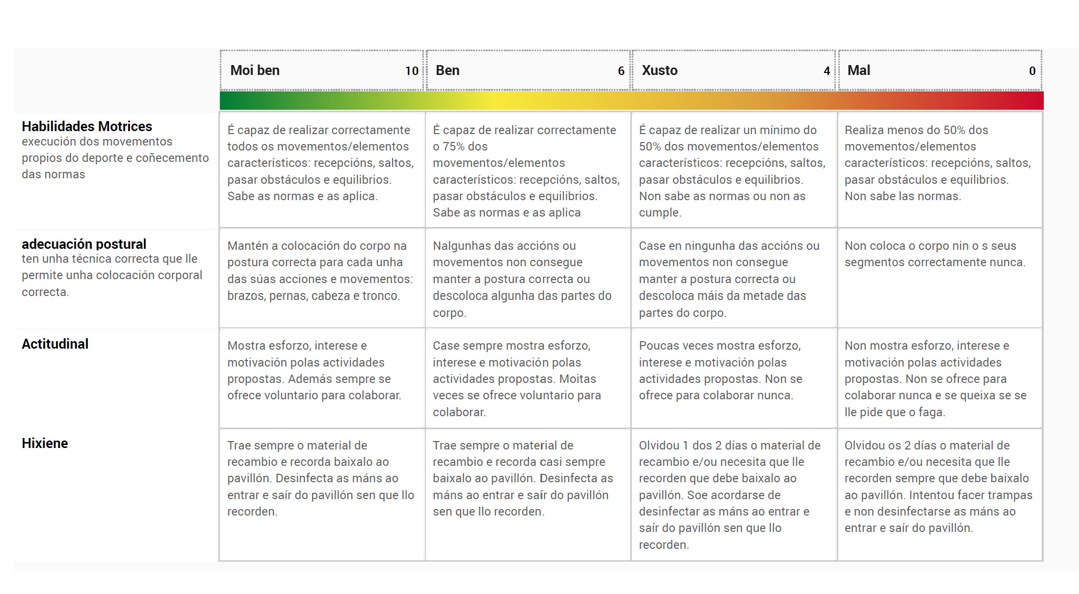 Sempre vos remarco que TODO o que pasa e facemos en EF conta para nota. Ese "todo" o currículo organizao en 4 grupos: