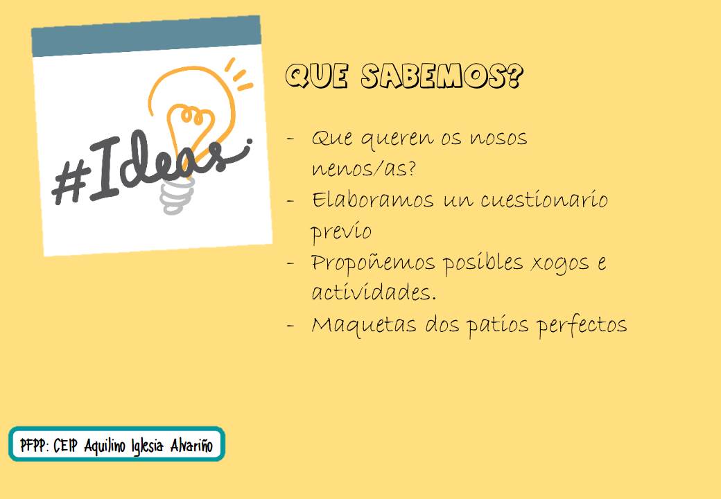 Os nenos e nenas do centro, son os que disfrutan do tempo de lecer. Pero é importante coñecer os seus gustos, intereses e motivacións; así como posibles ideas para integrar no noso patio. Ademais, recordando que é un lugar onde se acceden a moitas aprendizaxes e a convivir entre eles e elas.