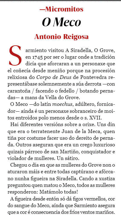 Sarmiento visitou A Siradella, O Grove, en 1745 por ser o lugar onde a tradición dicía que aforcaran a un personaxe que el coñecía desde meniño porque na procesión relixiosa do Corpo de Deus de Pontevedra re-presentábase solemnemente a súa derrota —con carantoña / facendo o fedello / botando perna-das— a mans da Vella do Grove. O Meco —do latín moechus, adúltero, fornica-dor— aínda é un personaxe sobranceiro de moi-tos entroidos polo menos desde o s. XVII.Hai diferentes versións sobre a orixe. Uns din que era o terratenente Juan de la Meca, quen tiña por costume facer uso do dereito de perna-da. Outros aseguran que era un crego luxurioso quizais párroco de san Martiño, conquistador e violador de mulleres. Un sátiro. Chegou o día en que as mulleres do Grove non o aturaron máis e entre todas captúrano e afórca-no nunha figueira na Siradella. Cando a xustiza preguntou quen matou o Meco, todos as mulleres responderon: Matámolo todas! A figueira desde entón só dá figos vermellos, cor do sangue do Meco, aínda que Sarmiento asegura que a cor é consecuencia dos fríos ventos mariños. (Micromitos - O MECO - Antonio Reigosa
