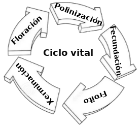 4-Xerminación: O froito libera as sementes, que caen ao chan que xerminan, formándose a nova planta. |