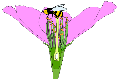 2-Fecundación: O pole entra polo pistilo fecundando o óvulo. O ovario cos óvulos fecundados empeza a engordar para transformarse en froito e os óvulos en sementes |