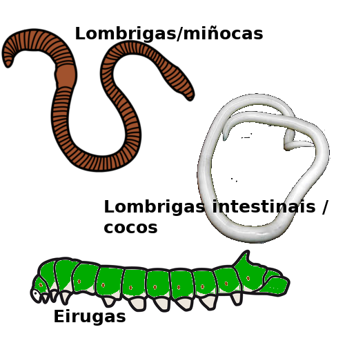 Teñen corpo alongado e brando, a maioría con aneis. As lombrigas ou miñocas terrestes son vermes de corpo longo, brando e cilíndrico, que vive na terra. Son moi beneficiosas xa que airean e renovan a terra, facéndoa máis fértil. As lombrigas intestinais son un verme parasito do intestino humano e dalgúns animais vertebrados. Infestámonos inxerindo os seus ovos, que se atopan no chan ou en alimentos mal lavados. Mantendo unha hixiene adecuada, lavando as mans antes de comer, evitaremos contaxios. A tenia ou solitaria: Verme de corpo longo dividido en segmentos planos, do que existen varias especies, que en estado adulto é parasito do intestino dos vertebrados, incluídos os humanos. Pode chegar a medir varios metros de lonxitude, invadindo o intestino delgado e alimentándose dos nutrientes intestinais. Existen moitas máis especies de vermes parasitos e tamén chamamos vermes as eirugas ou larvas dalgúns insectos que sofren metamorfose. |