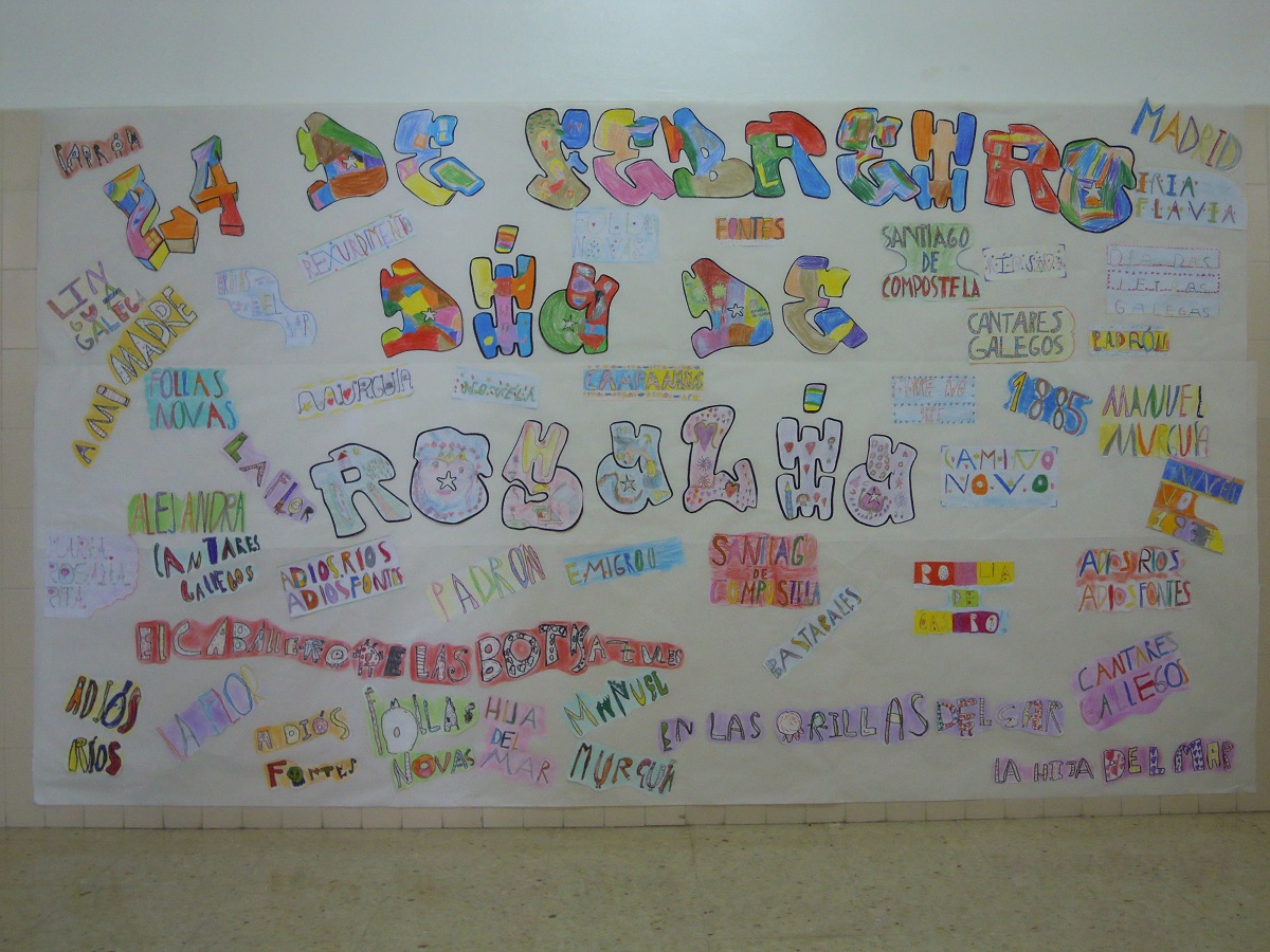 Confección dunmural-graffiti polo alumnado de Infantil e 1º Ciclo, para celebrar o Día de Rosalía, no que elexiron e decoraron palabras relacionadas coa autora.