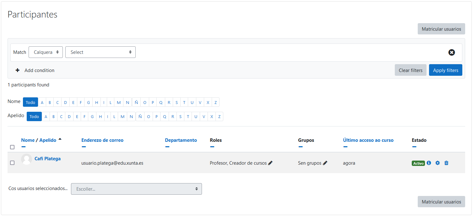 Cando seleccionamos Lista de participantes, na parte central da pantalla aparece a listaxe completa dos/as participantes (imaxe 2.2.2) debaixo dun abecedario que nos serve para filtrar os/as participantes que estamos vendo pola primeira letra do seu nome ou pola primeira letra do seu apelido. Ademais, sobre estes dous abecedarios, temos un recadro para engadir outro tipo de filtros que poden ser configurados para que se verifiquen todos ou algún deles. Entre os filtros dispoñibles temos: