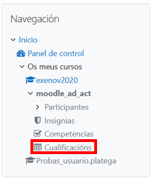 Moodle mostra no Libro de cualificacións as puntuacións que o alumnado obtén nas actividades do curso. Podemos acceder a este Libro de cualificacións dende Bloque Navegación -> Os meus cursos -> "Nome curto do curso en cuestión" (neste caso moodle_ad_act) -> Cualificacións (imaxe 2.3.1)