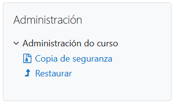 Nesta sección veremos cales son os pasos a seguir para facer unha copia de seguranza do noso curso. No caso de realizala é MOI IMPORTANTE ter rematadas e entregadas tódalas actividades anteriores xa que vai ser preciso perder o rol de Profesor que cada un de nós temos nos nosos respectivos cursos. Ademais, veremos tamén os pasos a seguir para restaurar esta copia de seguranza na aula virtual dos nosos centros. Neste segundo proceso, non obstante, é moi importante ter en conta que os pasos aquí mostrados poden non coincidir exactamente cos que nos podemos atopar nas nosas aulas virtuais.