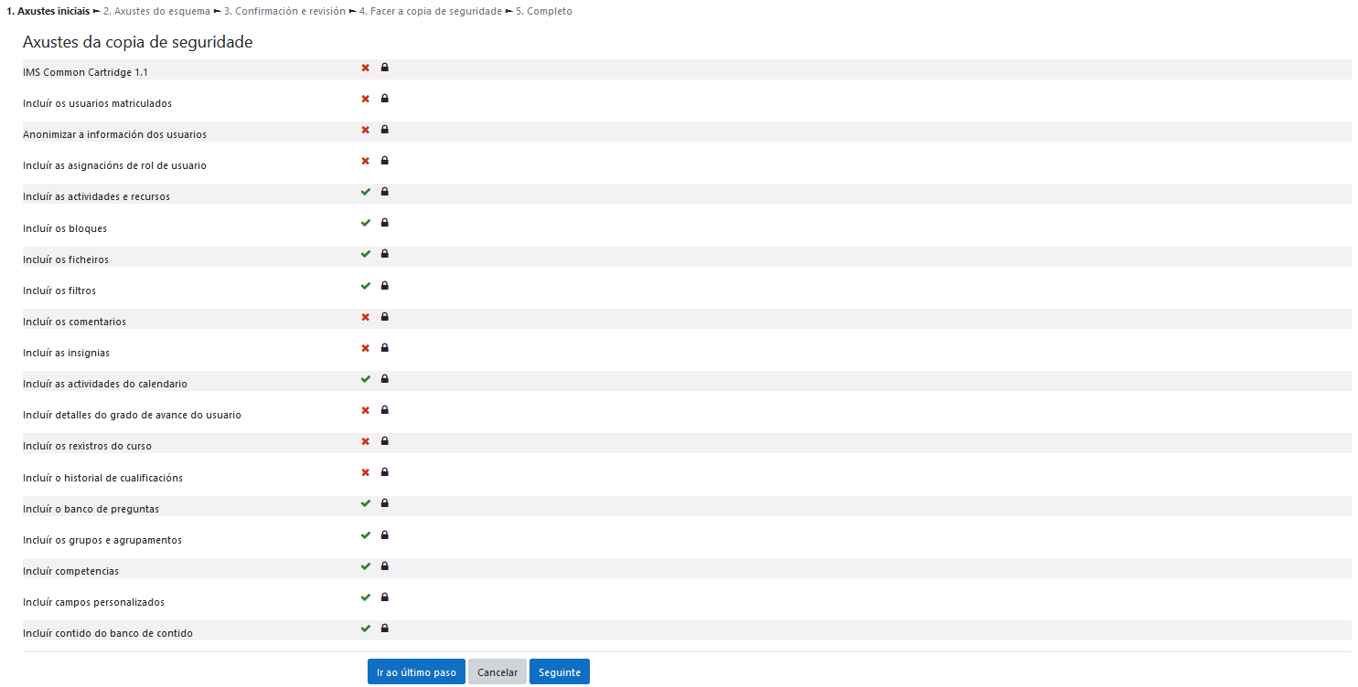 5. Prememos en Administración do curso -> Copia de seguranza. Isto levaranos á xanela 1. Axustes iniciais. En xeral neste primeiro punto podemos elixir (neste caso non pola configuración da aula virtual de prácticas) os elementos do curso que queremos incluír na copia. A opción de incluír ou non aos usuarios matriculados é especialmente importante. As copias de seguranza sen datos de usuario (a opción de Incluír os usuarios matriculados desmarcada) é a recomendada para restaurar o curso nun ano académico distinto ao curso actual ou no caso de cambio de centro por parte do docente. As copias de seguridade con datos de usuario poden servir sempre que queiramos unha copia fiel do estado da aula e o traballo do alumnado nun momento determinado e pode almacenarse o tempo que sexa necesario incluso por normativa legal ao igual que se almacenan os exames en papel etc. Para facer a nosa copia deixamos as opcións que saen por defecto e pulsamos no botón Seguinte.
