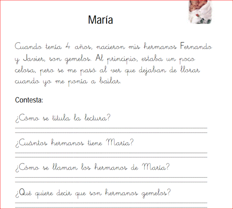 - Lectura comprensiva 1: Mi abuela Carmela, Lectura comprensiva 2: El jardín de primavera, lectura comprensiva 3.