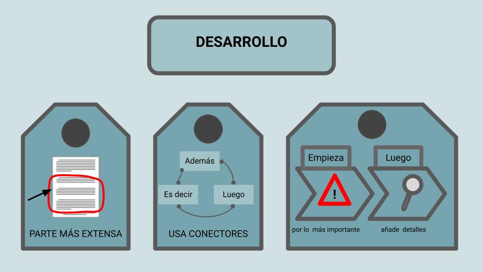 The development is the body of the exposition, the most extensive part where the topic is discussed. This section presents important information, essential characteristics and ideas, accompanied by some details and curiosities.