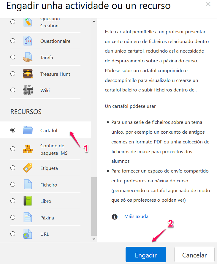 Ficheiros = Neste recadro introduciremos o ficheiros que queiramos mostarlles aos alumnos dentro do cartafol. Podemos usar o método de "arrastar e soltar" ou tamnén podemos usar o botón "Engadir" que aparece na esquina superior esquerda do recadro.