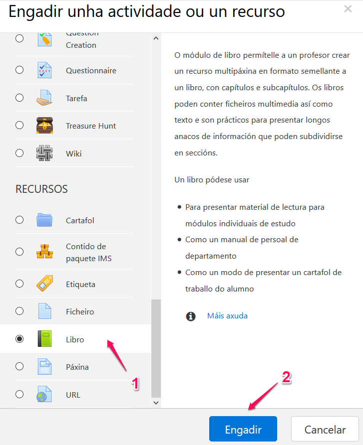 Para engadir un libro a un curso teremos que seguir os seguintes pasos: