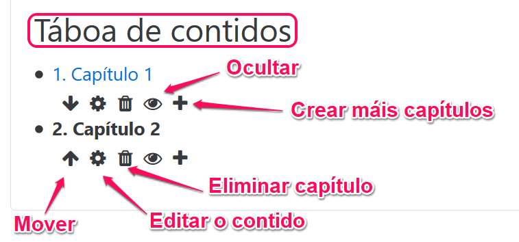 Despois de que o libro está creado, para xestionalo (engadir capítulos e subcapítulos) empregaremos o cadro "Táboa de contidos" que aparece na parte superior esquerda da pantalla, unha vez que entramos no propio libro.