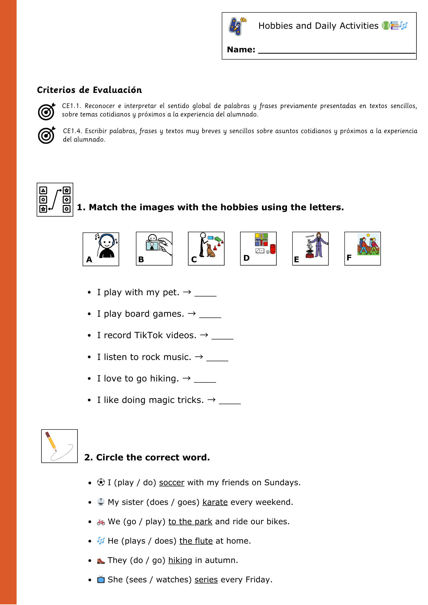 2- I play soccer, My sister does karate, We go to the park, He plays the flute, They go hiking, She watches series.