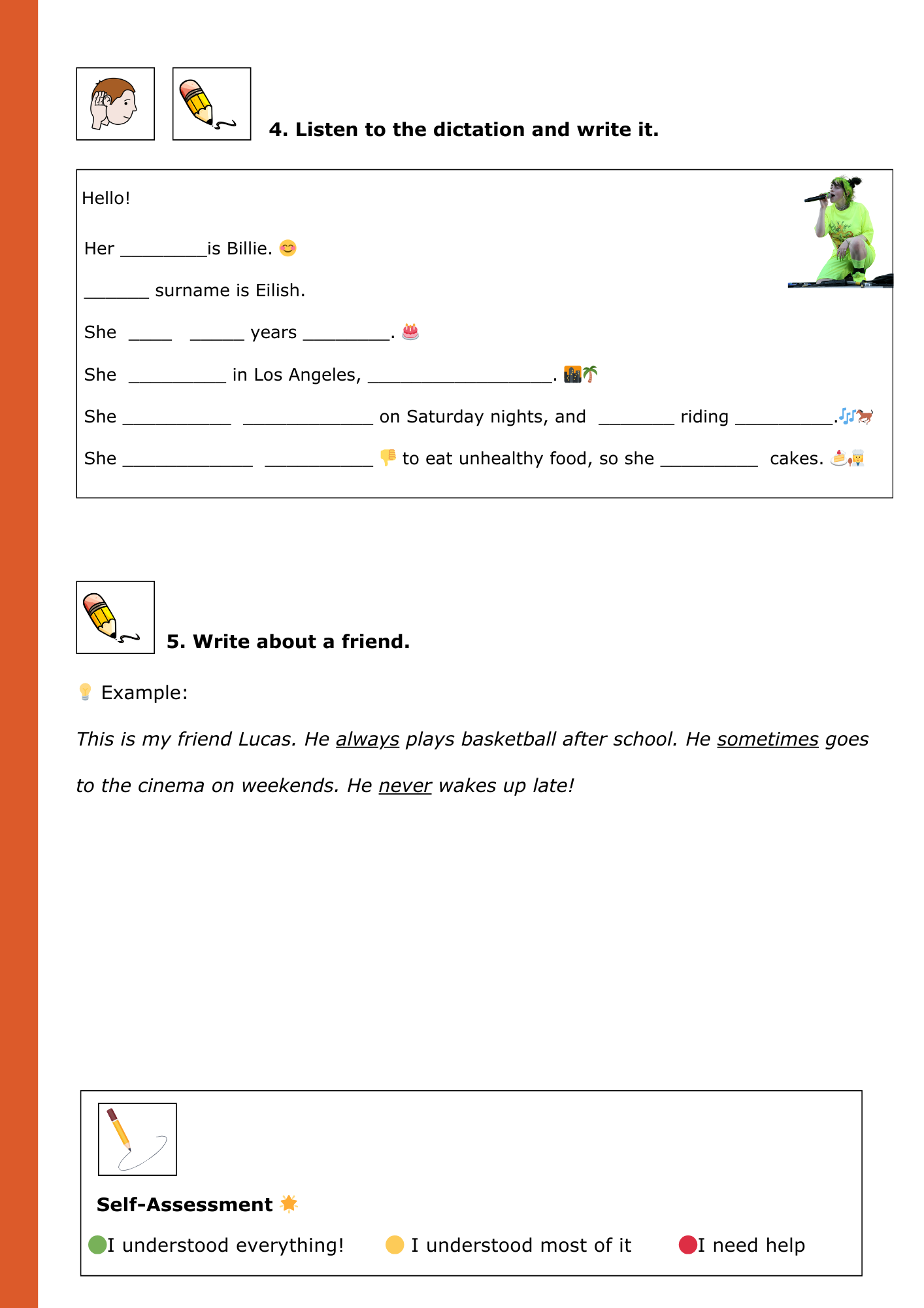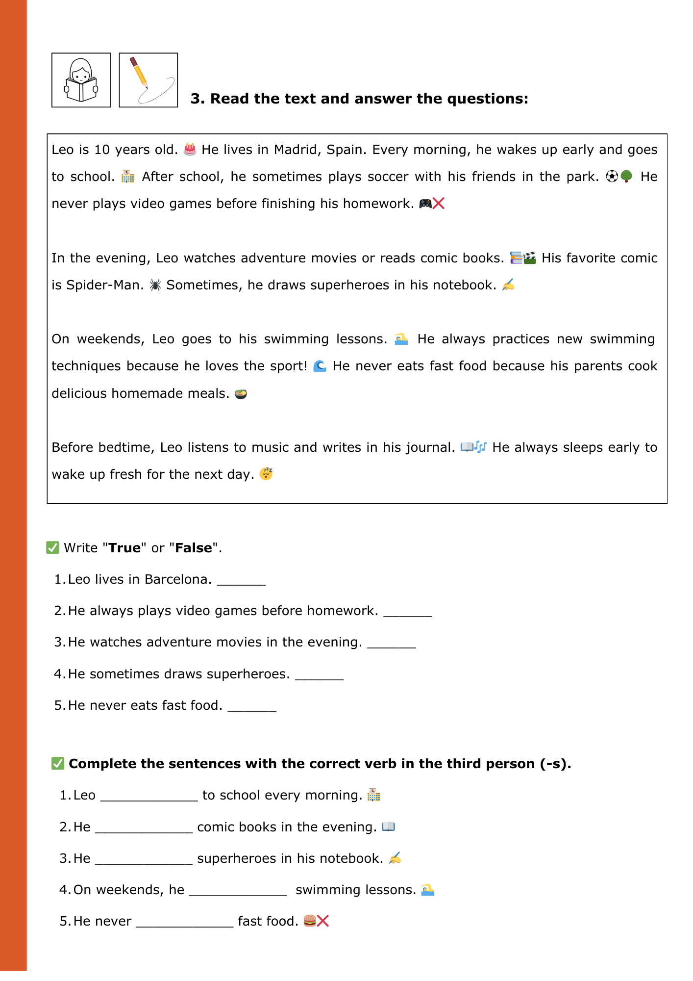 ♥ En la libreta, usa colores diferentes para resaltar verbos (I do karate; I play handball; I go swimming...) y preposiciones (on Fridays; in the sport centre; at home...)