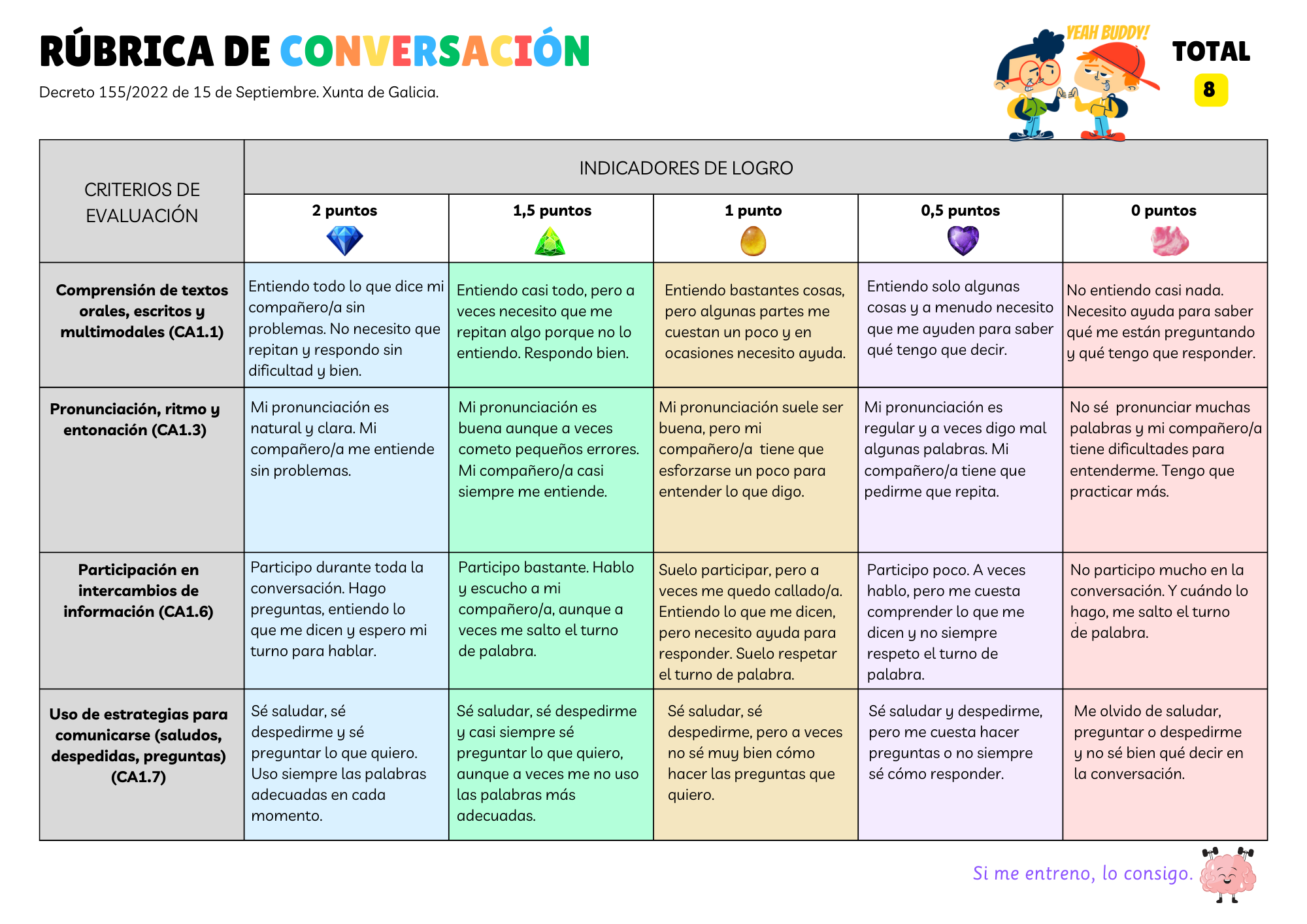 Esta rúbrica nos ayuda a valorar de forma objetiva y sencilla vuestro aprendizaje en las siguientes habilidades: comprensión de textos (habilidad de escucha) pronunciación (speaking), participación (interaction) y saber saludar, despedirse y tanto formular preguntas como dar respuestas (conversation).