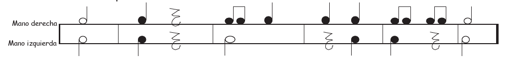 - A continuación interpreta cada parte por separado golpeando sobre una mesa con cada mano correspondiente: primero el ritmo de la mano derecha y después el ritmo de la mano izquierda.