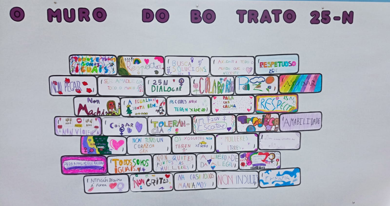 Con motivo do Día Internacional para a Eliminación da Violencia contra as Mulleres, o alumnado participou en varias actividades orientadas a promover a igualdade e os bos tratos. Elaboraron pulseiras conmemorativas e comezaron a crear un “muro do bo trato” con mensaxes positivas. Ademais, as patrullas lectoras visitaron ás aulas dos máis pequenos para compartir contos a favor dos bos tratos e contra a violencia de xénero. Foi unha xornada chea de reflexión e compromiso.