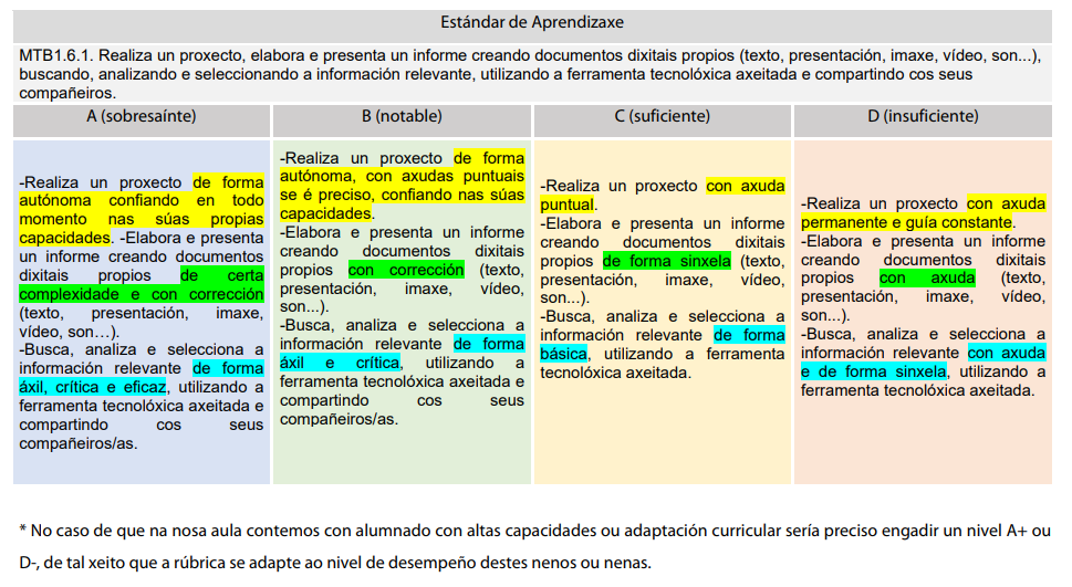Aquí atoparemos rúbricas que o profesorado pode empregar para avaliar distinas tarefas do proxecto