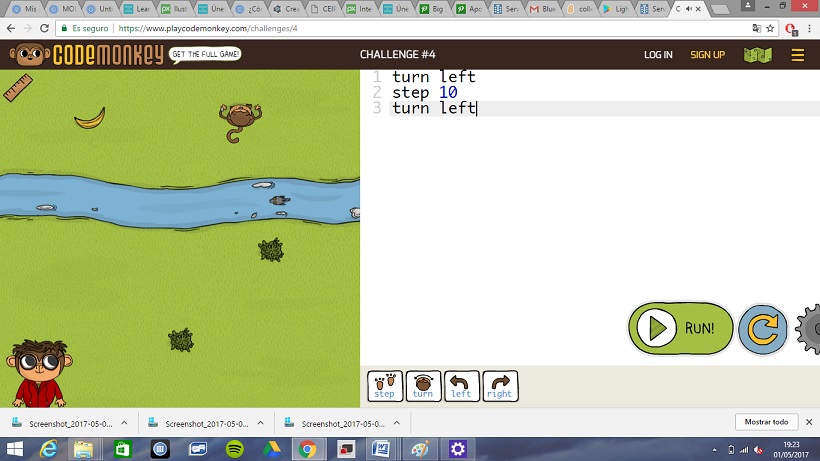 https://www.playcodemonkey.com/challenges/4 Teremos que levar ó mono a recoller os plàtanos. Os comandos están formados por símbolos fáciles interpretar. Na parte de arriba podemos ver o código inglés. Indicado para alumnado a partir de 2º de Primaria |