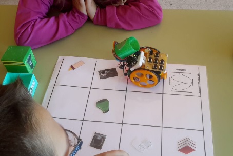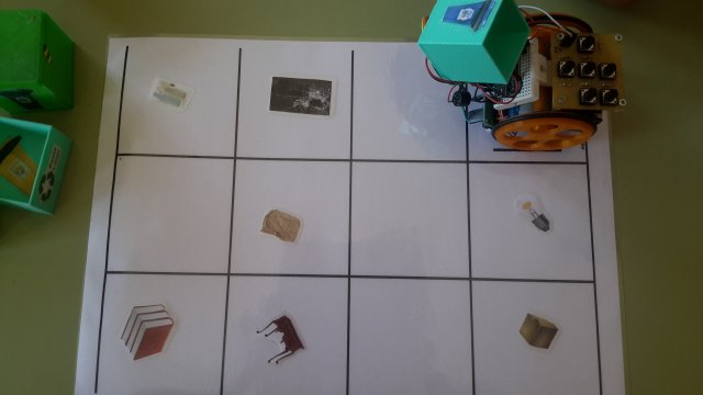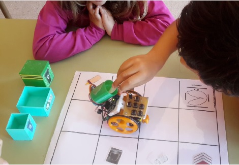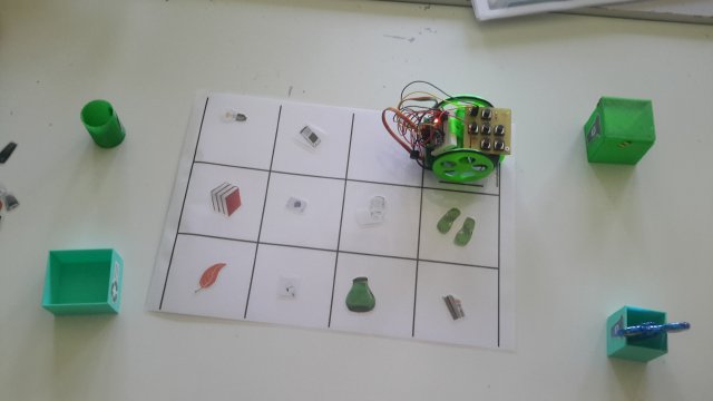 Pomos o contedor do vidro no escornabot e levámolo por toda a alfombriña recollendo o vidro |