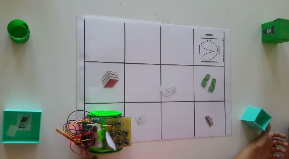 Temos a alfombriña con tarxetas de lixo. Nas esquinas están catro contedores feitos coa impresora 3D |