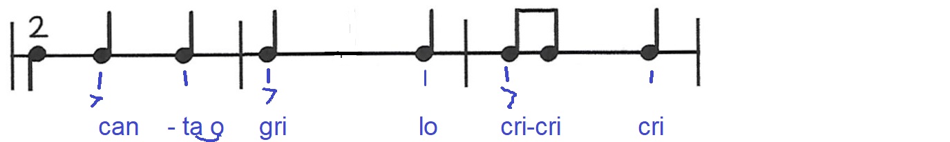 Exemplo do primeiro ritmo. Escribimos unha sílaba en cada figura tendo en conta o acento. Faino primeiro coas sílabas rítmicas e logo pensa nunha letra que encaixe.