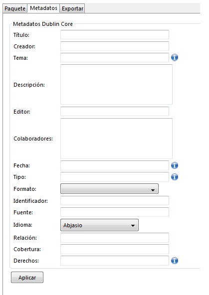 Esta subpestaña permite introducir los datos requeridos por Dublin Core. Dublin Core es un estándar de metadatos para recursos en bibliotecas que ofrece "información sobre la información".