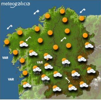 - Practicade a falar do tempo con esa imaxe e utilizade o vocabulario correcto ( vento, precipitacións, nubes e craros, temporal, borrasca, temperatura ...) edemais das referencias aos lugares que se marcan no mapa que escollades. Debedes dominar os termos de : norte, sur, leste e oeste en calquera mapa ,,,