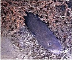 Carece de escamas e de aletas ventrais, mais si dispón de aletas pectorais. As aletas dorsal, caudal e anal reúnense formando unha crista cutánea que empeza xusto tras das aletas pectorais.