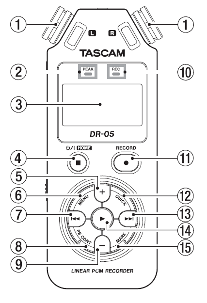 Micrófono condensador eléctrico stereo omnidireccional. Se conecta un micrófono ou entrada externas á toma MIC/EXT IN do panel traseiro, este micro interno quedará inactivo.