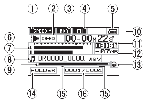 aparece na posición de reprodución na que fora fixado o punto final.16. Número de ficheiro de reprodución/total de ficheiros