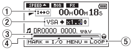 Aparece a velocidade de reprodución en comparación coa velocidade normal. VSA á esquerda indica que está activa a función VSA (escoita a velocidade variable: permite cambiar o tempo sen cambiar o ton).