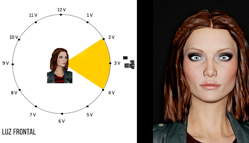 Cando situamos a fonte de luz á mesma altura que o suxeito iluminado, logramos un esquema que tende a disimular os volumes e a realzar a saturación.