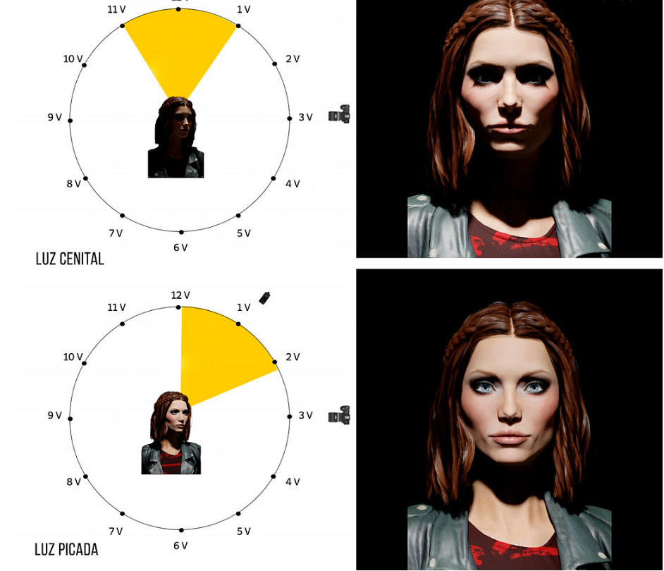 - Luz contrapicada, cuxo ángulo non é tan extremo e ilumina máis parte do rostro sen producir sombras tan acentuadas.