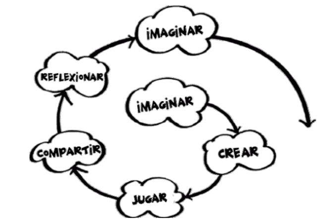 Xoga coas súas creacións, comparte as súas ideas e creacións con outros e reflexiona sobre as súas experiencias -o cal nos conduce a imaxinar novas ideas e novos proxectos. A medida que os estudantes atravesan este proceso, unha e outra vez, aprenden a desenvolver as súas propias ideas, probalas, desafiar os límites, experimentar con alternativas, obter retroalimentación de outros, e xerar novas ideas baseadas nas súas experiencias. Cando estas ideas non funcionan terán que volver cara atrás e corrixir; creando este especial continuo, partindo dunha idea créase un proxecto, que dá lugar a novas ideas, que xeran novos proxectos, e así, indefinidamente.
