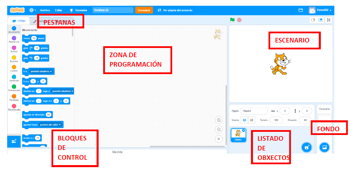 A pestana Código contén os bloques que arrastraremos á zona de programación e diralle ao obxecto as tareas que ten que realizar. Os bloques están clasificados por categorías e cada unha identifícase cunha cor: azul para movemento, verde para os operadores...