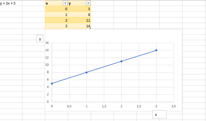 A ecuación da recta é do tipo y = ax + b, onde a é a pendente da recta ou inclinación e b a ordenada da orixe ou punto de onde parte non eixe vertical. Para representala hai que facer unha táboa na que se lle asignan valores ó x e calculamos coa ecuación os correspondentes valores de y. Despois representamos os datos nuns eixes coordenados.