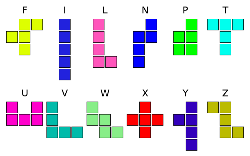 Que é? É un puzle matemático formado por 12 pezas diferentes denominadas con diferentes letras do abecedario. Cada forma está composta de 5 cubos unidos por algún dos seus lados.