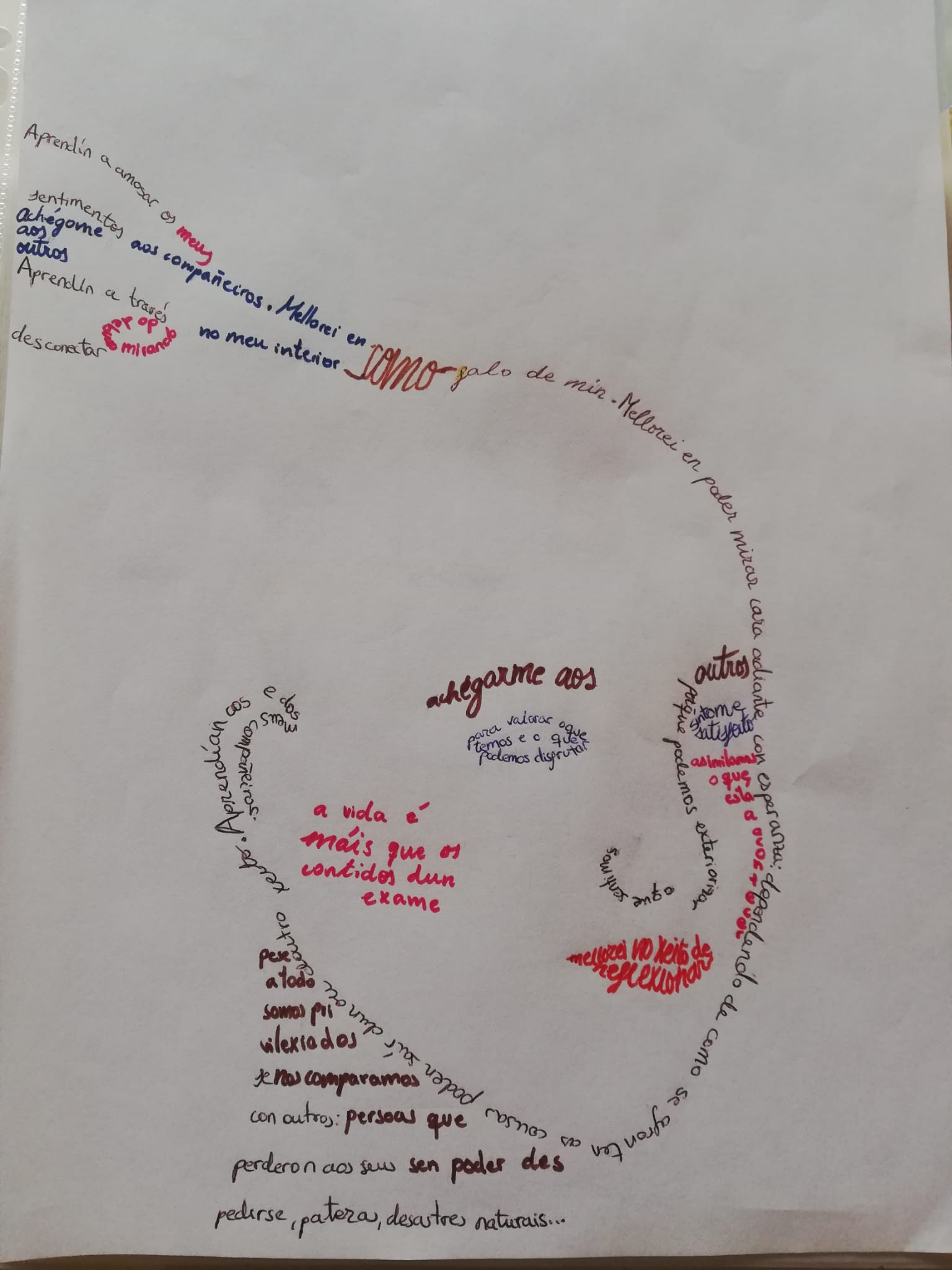 O alumnado reflectiu a avaliación do obradoiro nun caligrama.