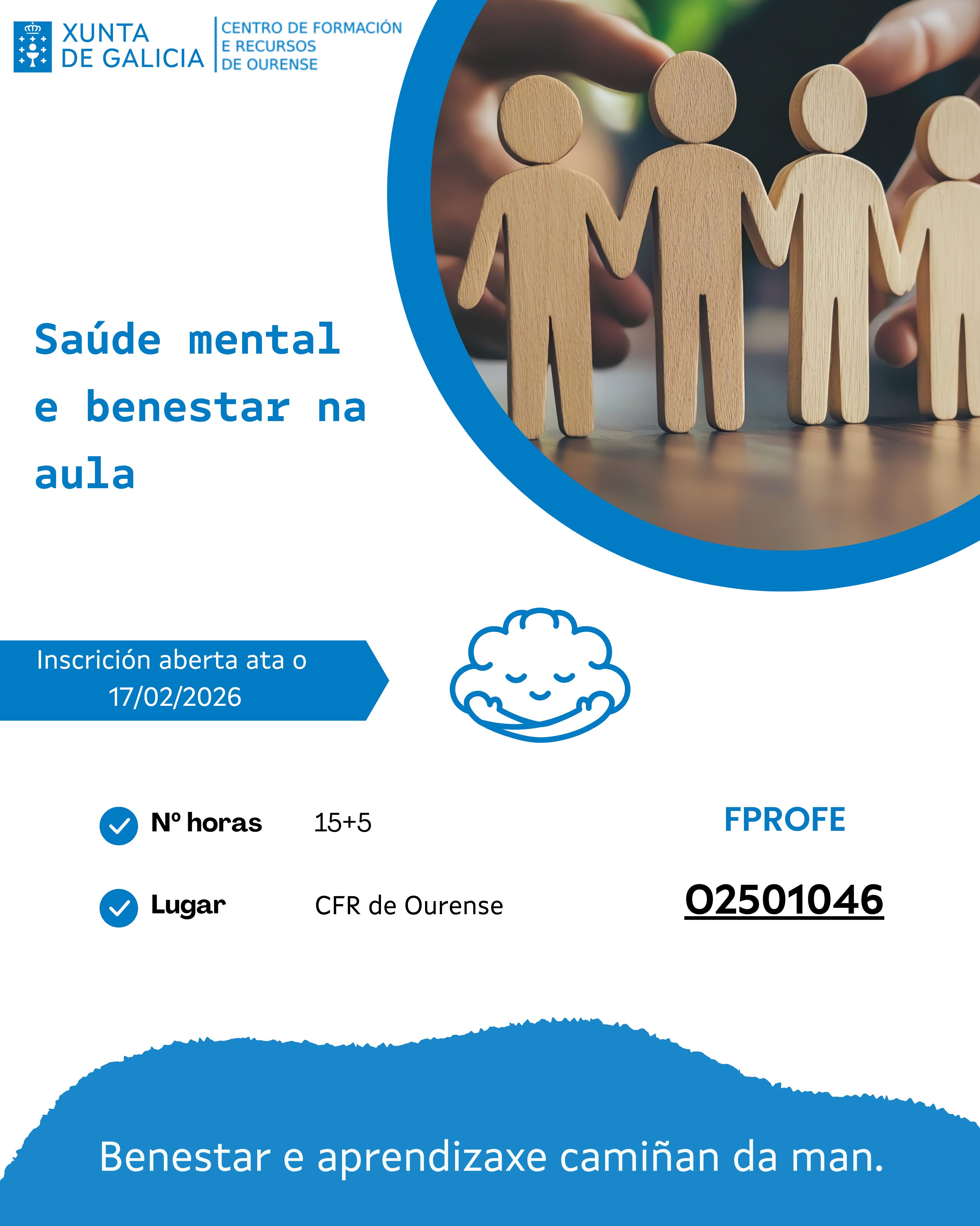 O curso busca, en definitiva, dotar o profesorado de coñecementos, estratexias e recursos que lle permitan promover o benestar emocional na aula, desenvolver prácticas de prevención e crear espazos educativos onde sentirse ben e aprender sexan dous camiños que se constrúen xuntos.