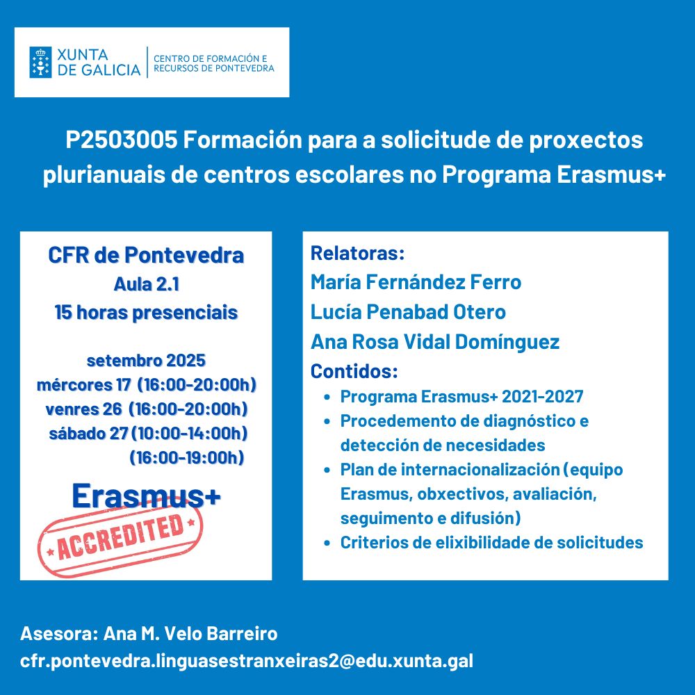 Esta actividade está deseñada para preparar a solicitude de acreditación Erasmus+ individual para centros do sector de educación escolar, cuxo prazo de entrega remata o 1 de outubro de 2025.