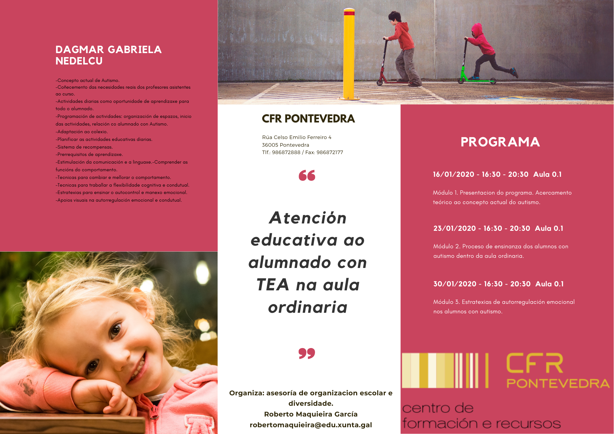 As nenas e nenos con Diabete: un reto ou unha oportunidade?.Aspectos básicos da Diabete.Síndrome de Asperger: estratexias de detección e intervención na aula. A discapacidade visual e a diversidade da aula. Altas capacidades. Por que, quen, para que e como. Detección e prevención do abuso sexual. Educando na inclusión. A discapacidade auditiva. Sistema educativo e alumnado xitano. Dislexia e outras dificuldades da aprendizaxe. Educación inclusiva na práctica docente. Alumnado con alteracións neuromotrices en educación. A saúde mental é cousa de todos/as. Unha escola para tod@s: atención educativa do alumnado coa síndrome de Down e outras discapacidades intelectuais. A prevención é saúde. Obxectivo e áreas de actuación de ABAP. TEA no ámbito escolar. A Educación como base para o tratamento do TDAH.