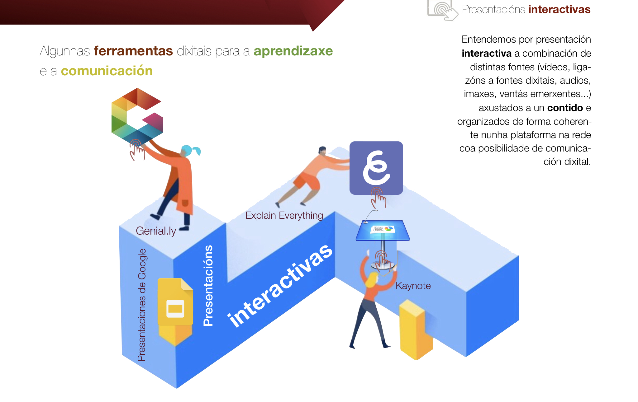 Entendemos por presentación interactiva a combinación de distintas fontes -vídeos, ligazóns a fontes dixitais, audios, imaxes, ventás emerxentes...- axustados a un contido e organizados de forma coherente nunha plataforma na rede coa posibilidade de comunicación dixital. Un exemplo.