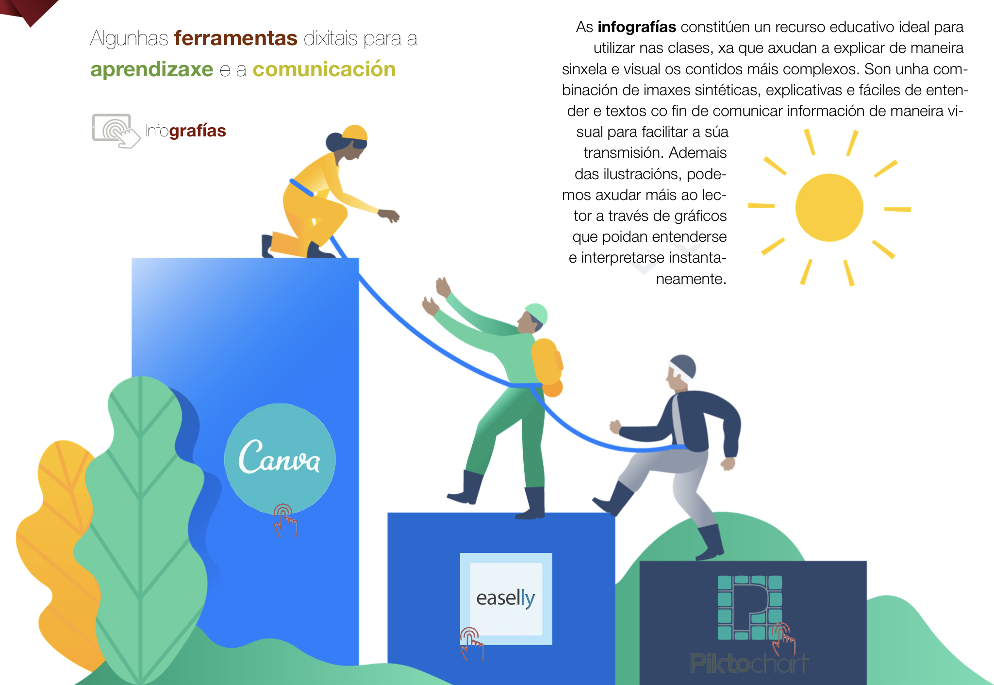 As infografías constitúen un recurso educativo ideal para utilizar nas clases, xa que axudan a explicar de maneira sinxela e visual os contidos máis complexos. Son unha combinación de imaxes sintéticas, explicativas e doadas de entender e textos co fin de comunicar información de maneira visual para facilitar a súa transmisión. Ademais das ilustracións, podemos axudar máis ao lector a través de gráficos que poidan entenderse e interpretarse instantaneamente.