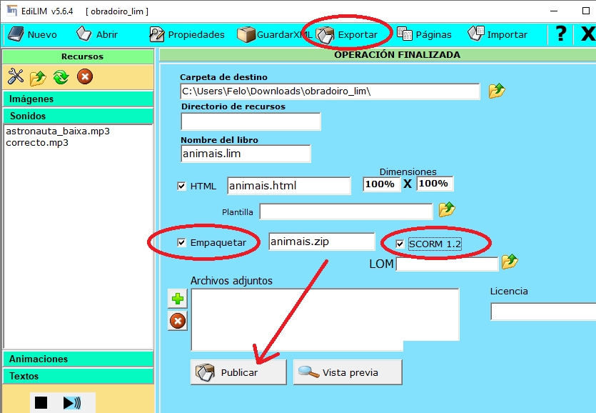 Constrúe un libro sinxelo con varias páxinas á túa eleccion. Lembra cando esteas no proceso de exportar, activar as casiñas empaquetar e SCORM