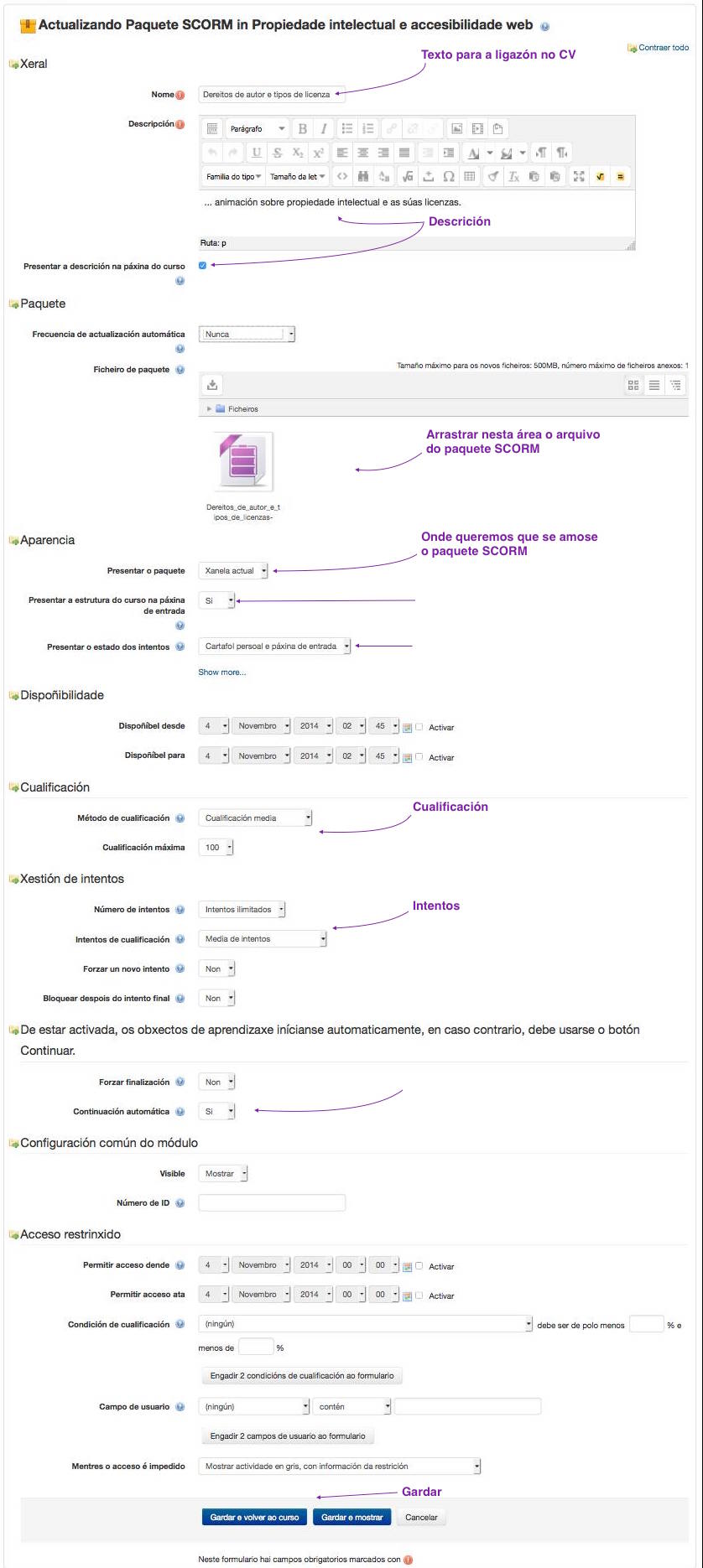 - Paquete SCORM, paquetes de contidos xerados con outras aplicacións diferentes de Moodle, como eXe, que se integran no curso virtual. As preguntas inseridas no paquete SCORM intégranse no curso de Moodle e a súa cualificación aparecerá en "Cualificacións".