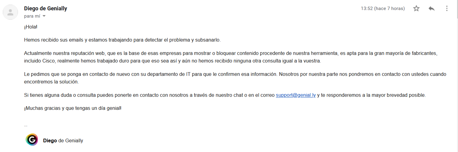 A mediados de abril pasou algo semellante. Comunicámosllo por e-mail a Genially e solucionaron nun par de días. Segun parece por un problema cun dos certificados de seguridade. Durou 15 días, porque o día 8 de maio volveu fallar. Levo dándolles a tabarra desde ese día e a ultima noticia que teño deles é neste mail de hoxe no que non me aclaran nada.